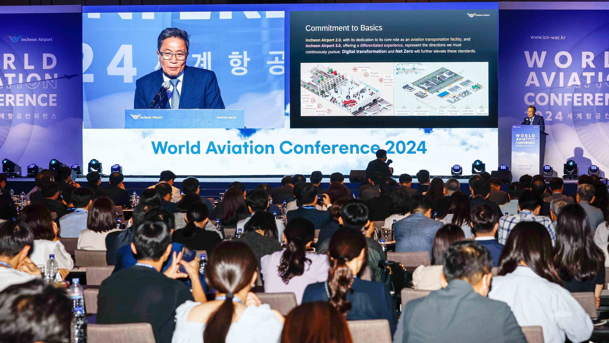 이번 행사에서는 이학재 인천공항공사 사장과 루이스 펠리프 국제공항협의회(ACI) 세계본부 사무총장이 기조연설을 맡았습니다. 이학재 사장은 인천공항을 인공지능(AI) 허브화, 디지털 전환, 그리고 친환경 공항으로 발전시키기 위한 '인천공항 비전 2040'을 설명했습니다. 그는 인천공항이 미래형 스마트 공항으로 나아가기 위한 계획을 공유하며, 기술 혁신과 지속가능성을 중점적으로 강조했습니다.
