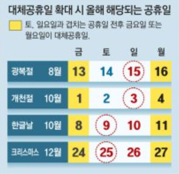 오우~ 대체공휴일 확대 법안이 국회 행안위에서 논의되고 있고, 빠르면 8월 15일 광복절부터 적용토록 할 것으로 알려지고 있습니다.